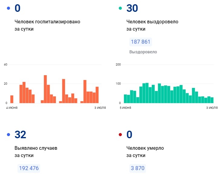 Выздоровели 30 пациентов, с начала пандемии — 187,8 тысячи.