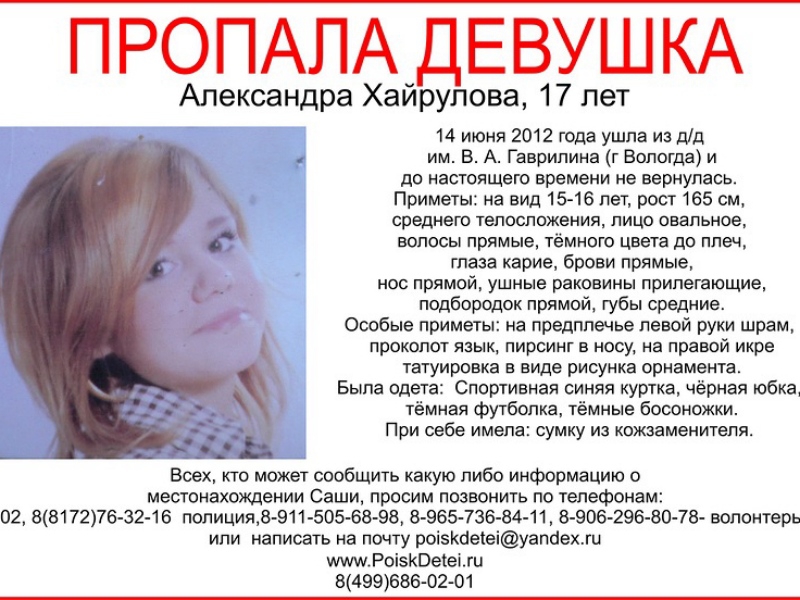 Приметы пропавшей: на вид девушке 15-16 лет, рост 165 сантиметров, среднего телосложения, лицо овальное, волосы темные прямые, до плеч, глаза карие, брови прямые, нос прямой. Особые приметы: шрам на предплечье левой руки, пирсинг в языке и в носу, на правой руке татуировка в виде рисунка орнамента. Пропавшая была одета в спортивную синюю куртку, чёрную юбку, тёмную футболку и тёмные босоножки. При себе имела сумку из кожзаменителя. Всех, кто может сообщить какую либо информацию о местонахождении Саши, просим позвонить по телефонам: 02, 8(8172)76-32-16 — полиция, 8-911-505-68-98, 8-965-736-84-11, 8-906-296-80-78 — волонтеры.