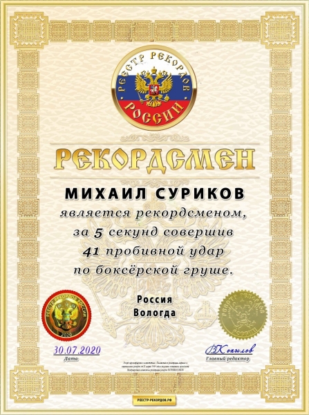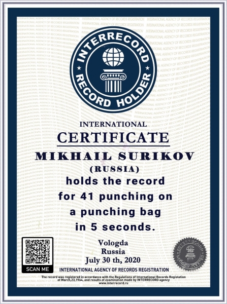 Михаил Суриков за 5 секунд нанес по боксерскому мешку 41 удар, побив предыдущий рекорд, который принадлежал профессиональному американскому боксеру Чеду Доусону.