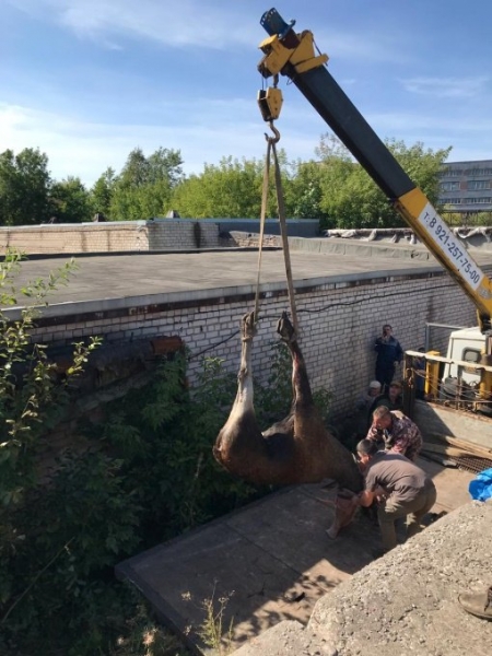 С помощь подъемного крана спящего лося увезли из Череповца в лес