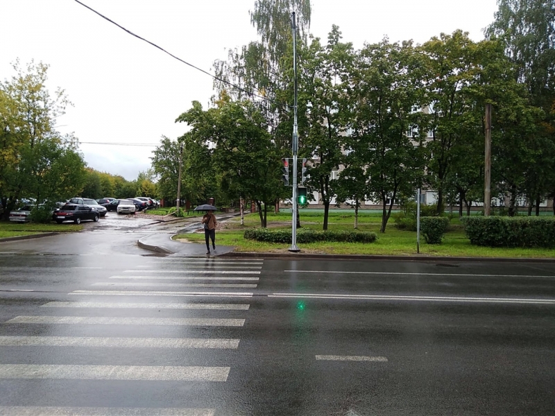 Светофор в этом месте просили жители. По их мнению, требовалось сделать переход безопаснее, так как здесь находится колледж, детский сад, почтовое отделение, Зеленый сигнал для пешеходов загорается по требованию, то есть при нажатии кнопки.