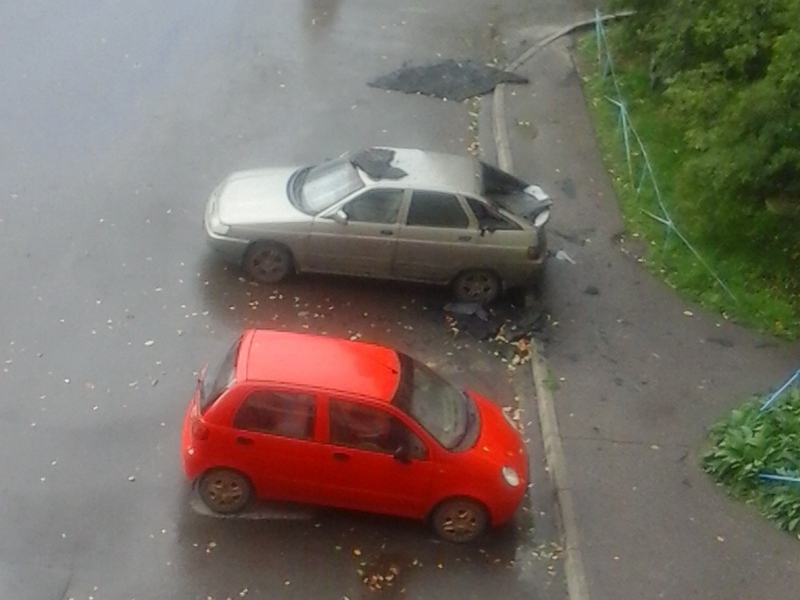 На Ленинградской, 91 лист железа повредил стоящие у здания автомобили