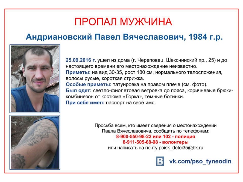 Информацию о местонахождении Павла можно сообщать полиции по телефону 02 или волонтёрам: 8(911)505-68-98.