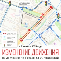 Движение на этом отрезке будет организовано в одном направлении. Водители, следующие по улице Козленской через Мяснорядский мост, смогут повернуть направо на четную сторону улицы Мира и далее выехать на нечетную сторону проспекта Победы. Также автомобилистам разрешат правый поворот с улицы Батюшкова на проспект Победы.