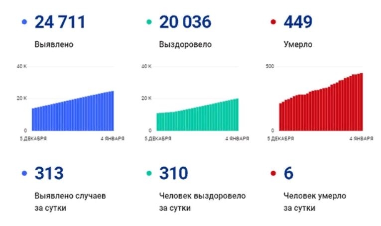 За последние сутки выписали 310 человек. Однако прибавилось 313 новых заболевших. Общее число заразившихся достигло 24711. Таковы данные на утро 4 января.