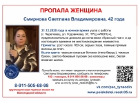 42-летняя Светлана Смирнова ушла с работы ночью 31 декабря. Женщина работает в торговом центре "Июнь" на Годовикова, 37. Возможно, доехала до остановки "Красный ткач". Сейчас местонахождение череповчанки неизвестно. ПСО "Ты не один распространяет информацию о поиске.