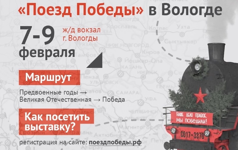 В Вологодской области «Поезд Победы» будет открыт с 7 по 9 февраля. Посетители увидят фотографии довоенной жизни, совсем юных бойцов, снимки из военных окопов, а также побывают в военном госпитале, станут свидетелями научных прорывов того времени, блокады Ленинграда и свидетелями истязаний солдат в концлагере.