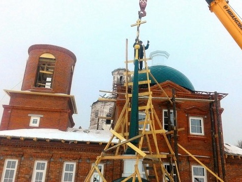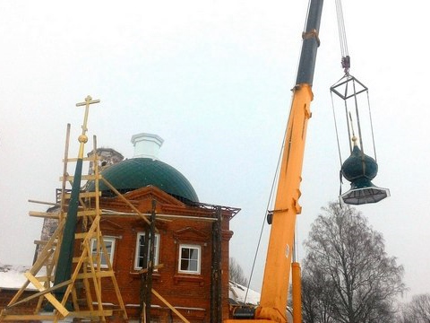 На молебне присутствовали жители села, школьники, мастера-кровельщики, архитектор храма, представители застройщика. По окончании молитвы собранные на земле купола подняли краном на храм.