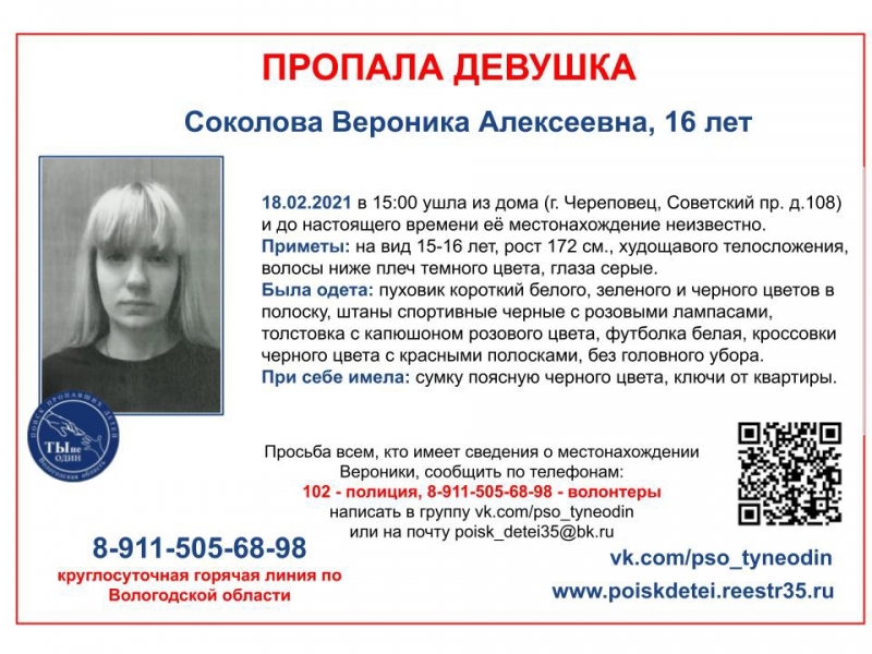 Вероника Соколова ушла из дома еще 18 февраля. Подросток живет на Советском проспекте, 108. ПСО "Ты не один" распространяет информацию о поиске.