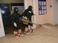 Особенность технологии в том, что дезраствор поступает на раскаленную трубу и превращается в туман. Под действием высокой температуры раствор расщепляется на мелкие капли размером чуть больше самого вируса. Они уничтожают вирус в воздухе и на поверхности предметов. Густое облако дезсредства способно попасть даже в самые труднодоступные места. Работа ведется специалистами в защитных костюмах.