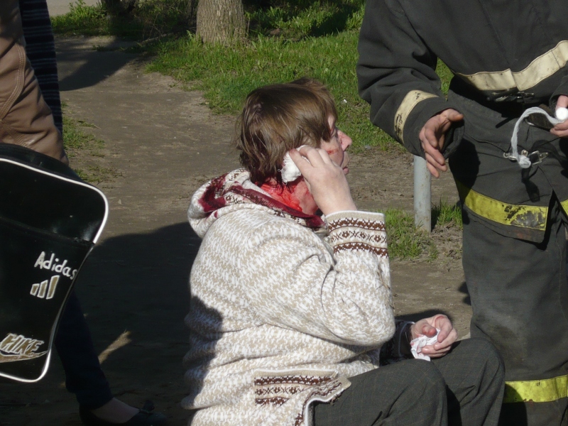 Первыми на место аварии прибыли пожарные. Они оказали психологическую помощь пострадавшей и наложили ей повязку на рану. Позднее женщину с ушибом головного мозга и переломом свода основания черепа доставили в реанимацию.