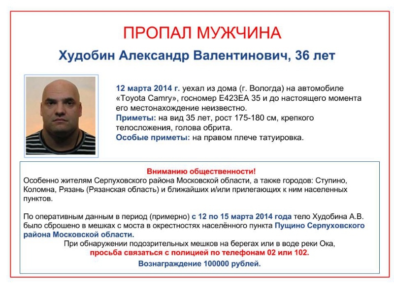 Напомним, что 35-летний Александр Худобин пропал без вести еще 12 марта. Он уехал из областной столицы на своем личном автомобиле. С тех пор ни мужчину, ни его машину никто не видел. Вскоре по факту исчезновения Александра возбудили уголовное дело. Как стало известно, предположительно, с 12 по 15 марта, тело мужчины сбросили в мешках в водоем неподалеку от населенного пункта Пущино Серпуховского района Московской области. Такое объявление появилось в группе поискового отряда "Ты не один" "ВКонтакте".