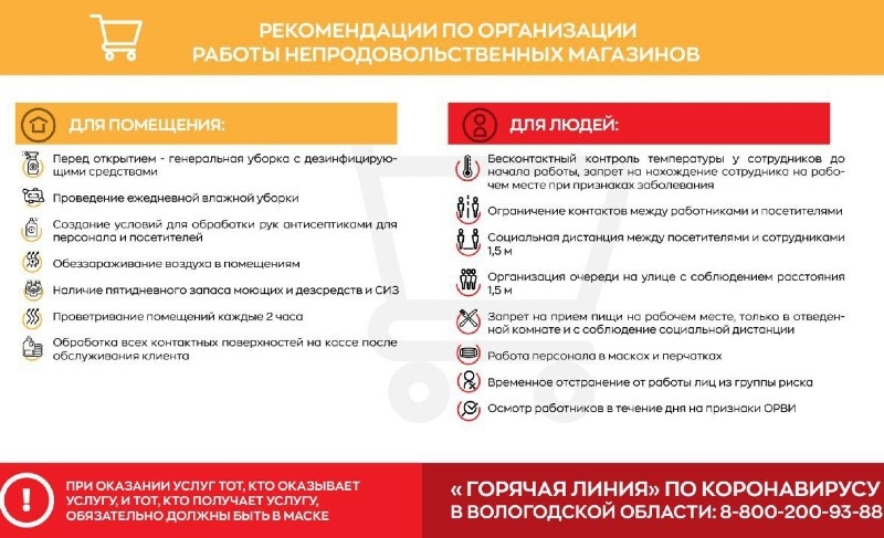 Несмотря на то, что каждый день в Вологодской области фиксируют новые случаи, в регионе запущена первая волна выхода из карантина. Начали работать предприятия сферы услуг, промышленные магазины. Но при этом им необходимо соблюдать все меры профилактики от заражения инфекцией. Соблюдение масочного режима, дистанции, дезинфекция помещений, сообщает ИА "СеверИнформ".