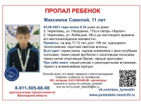 Савелий ростом 156 сантиметров, выглядит на свой возраст. Ребенок худощавого телосложения, с короткими светлыми волосами. Был одет в темно-синие спортивные брюки, темно-серую футболку с салатовыми полосами, черную олимпийку с голубыми полосами, серую кепку, черные кроссовки. С собой взял серый рюкзак, термос в алюминиевом корпусе.