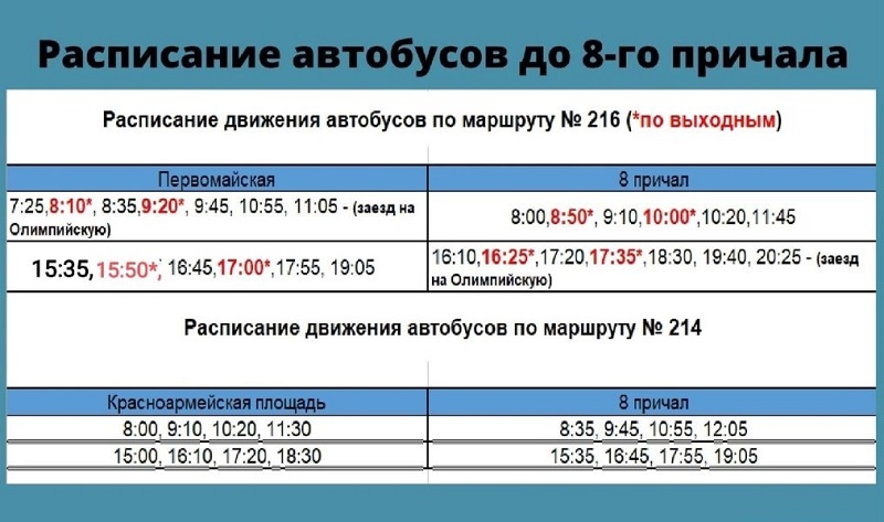 По субботам и воскресеньям четыре добавочных автобуса будут отправляться с ул. Первомайской в 8:10, 9:20, 15:50 и 17:00, в обратном направлении с восьмого причала — в 8:50, 10:00, 16:25 и 17:35. Также сохранится все предыдущее расписание маршрута.