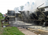 Когда кабина цементовоза сгорела, огонь перекинулся на груз лесовоза. Прибывшие на место пожарные потушили древесину. Дорога в этом направлении перекрыта.