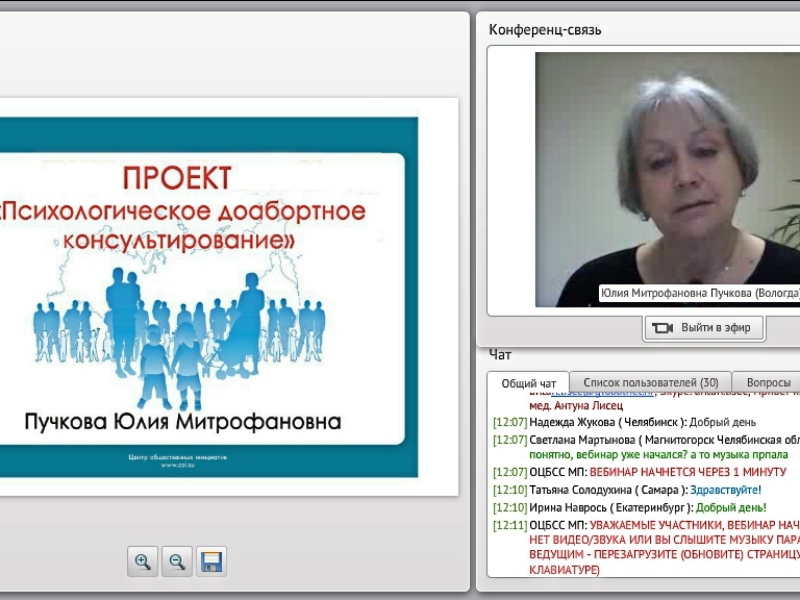 Особое внимание на вебинаре было обращено на то, что все психологи, занимающиеся доабортным консультированием, имеют специальную подготовку. В вологодском центре этой работой занимаются только профессионалы в области практической психологии, которые имеют высшее образование и регулярно проходят дополнительное обучение. А консультации с женщинами проводятся системно при участии специалистов смежных профессий: медиков и социальных работников.