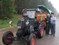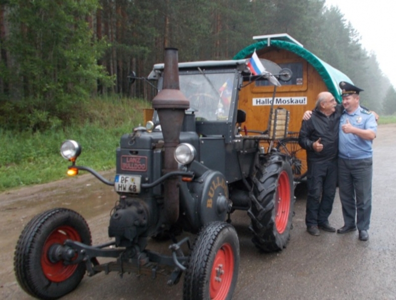 Районный инспектор Гостехнадзора Михаил Соколов осмотрел трактор «Lanz Bulldog» 1936 года выпуска с прицепом в виде пивной бочки, который на самом деле — переоборудованный мобильный дом. Все бумаги и транспорт у немца оказались в полном порядке.