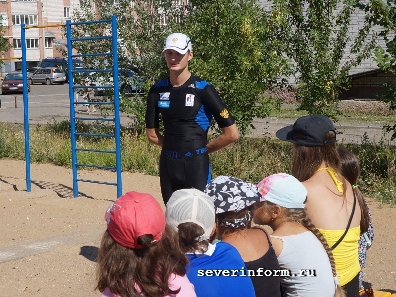 Максим Цветков посетил одну из площадок «Города детства» в понедельник, 4 августа. Сначала известный спортсмен рассказал ребятам о себе и ответил на их вопросы. Затем Максим провел с малышами разминку и показал несколько упражнений, которые выполняют его коллеги по сборной России. Напомним, недавно уроженец города Бабаево подписал договор о сотрудничестве с Вологодской областью и теперь представляет не только Москву, но и родной регион.