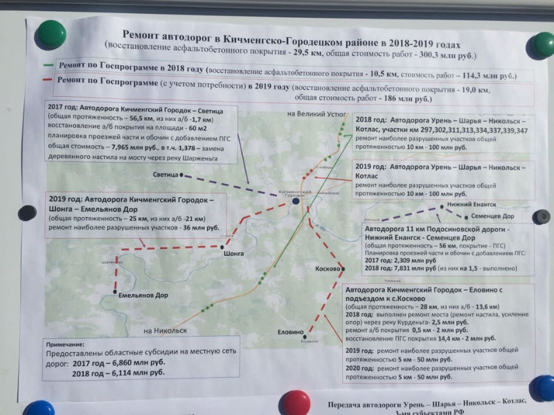 Кроме того, в ближайшие годы будут отремонтированы дороги Кичменгский Городок – Шонга - Емельянов Дор, Кич- Городок – Еловино с подъездом к село Косково, сообщает ИА «СеверИнформ».