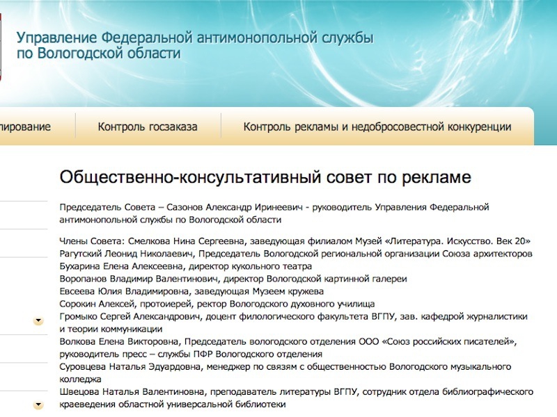 В Общественном совете по рекламе при вологодском Управлении ФАС нет специалистов отрасли. Об этом сообщает ИА «СеверИнформ — Новости Вологодской области». На сайте областного Управления антимонопольной службы размещен список «экспертов», в котором значатся имена десяти человек. Среди них руководитель кукольного театра, картинной галереи и музея кружева.