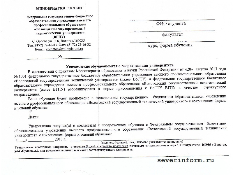 Как сообщает ИА «СеверИнформ», подобные уведомления деканы факультетов должны вручить всем студентам ВГПУ до 9-го сентября. Таким образом, вуз станет структурным подразделением ВоГТУ. Выпускники будут получать дипломы об окончании другого учебного заведения.