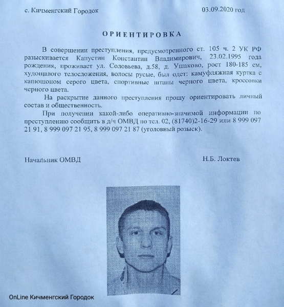 А между тем, на убийцу, сбежавшего из полиции, составлена ориентировка. В ней описан худощавый мужчина, с русыми волосами, ростом 180-185 см, в камуфляжной куртке с серым капюшоном, в черных спортивных штанах, сообщает «СеверИнформ».