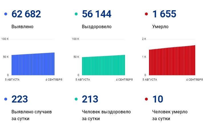Выздоровели 56144 пациента, за последние сутки с больничного выписали 213 человек. Такова официальная статистика на утро 4 сентября.