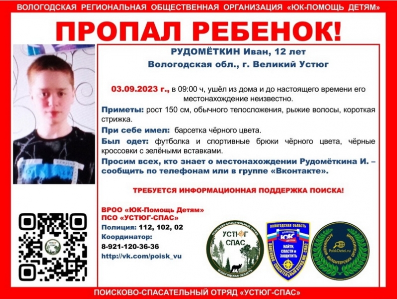 Сейчас его поисками занимается полиция, МЧС и волонтеры «Устюг-Спаса». Про мальчика известно немного. Ушел из дома в 9 утра воскресенья. Был одет в черную футболку, спортивные брюки и кроссовки, при себе может иметь барсетку. Парень рыжий, короткая стрижка, невысокий.