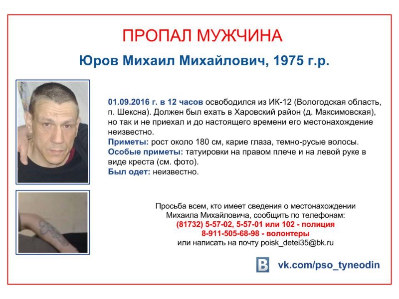 В Вологодской области разыскивают Михаила Юрова. 1 сентября он освободился из ИК-12 в Шексне и должен был отправиться в деревню Максимовская Харовского района. Однако до места назначения так и не добрался, сообщает ИА "СеверИнформ" со ссылкой на ПСО "Ты не один".