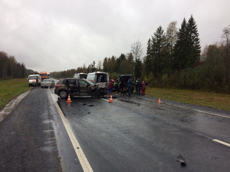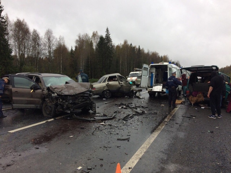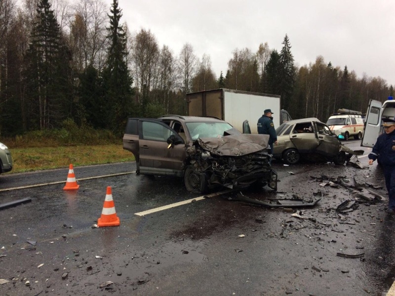 Столкновение машин ВАЗ-2110 и двух «Фольксвагенов» произошло сегодня около 10 часов утра на 518 километре трассы Москва – Архангельск, неподалеку от поселка Кадников.
