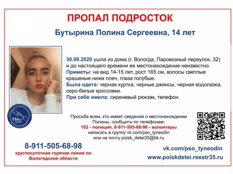 14-летняя Полина Бутырина ушла из дома еще 30 сентября. Девочка живет на Паровозном переулке, 32. До сих пор неясно, где сейчас находится подросток. ПСО "Ты не один" распространяет информацию о поисках.