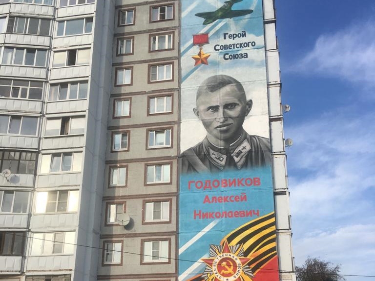 Гигантское изображение летчика-истребителя Алексея Годовикова украсило девятиэтажку на одноименной улице. На доме №26 появился рисунок площадью более 180 квадратных метров. Специалисты называют это граффити самым большим в городе.