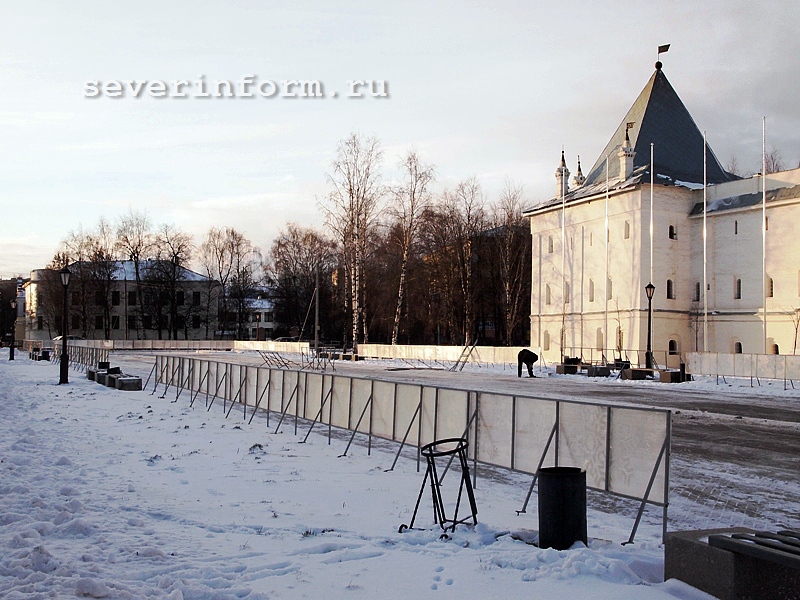 На Кремлевской площади в Вологде уже начали огораживать будущий каток. Работы начались накануне, 3 декабря, и продолжаются сегодня, в день выборов, сообщает ИА «СеверИнформ – Новости Вологды». Вокруг площадки установили прозрачное ограждение, а рядом – помещение в виде купола, где можно будет переодеться и поменять обувь на коньки. Напомним, каток площадью две тысячи метров появится на Кремлевской площади впервые в этом месяце. Вход на ледовую площадку будет платным. Всего в Вологде этой зимой оборудуют более 30-ти катков и хоккейных кортов. Пункты проката традиционно будут работать на Набережной VI Армии и на стадионах города.
