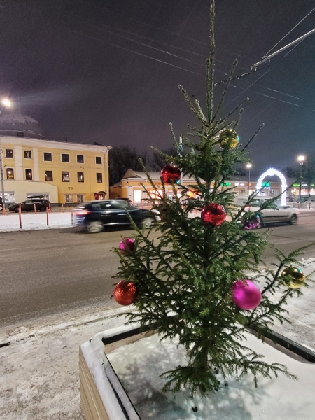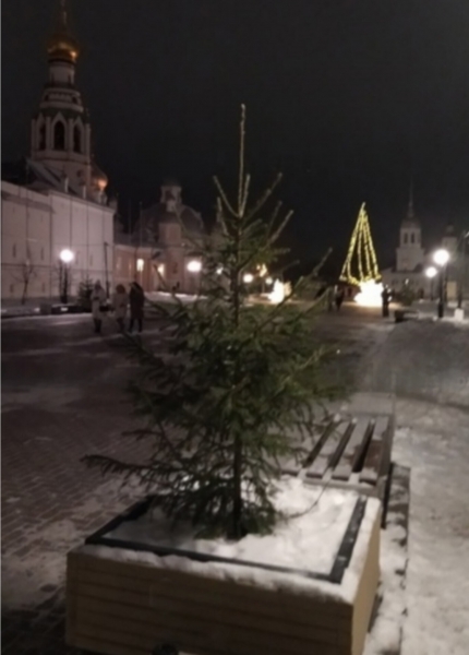 В этом году на улицах Вологды установлено около десятка небольших елочек в кадках. Они расположены в основном в центральной части и на площадях. Все елки были украшены шарами. Но накануне в паблике «Подскажите Вологда» пользователи выложили фотографию кадки на Кремлевской площади. Елка оказалась «раздетой», все шары с нее исчезли.