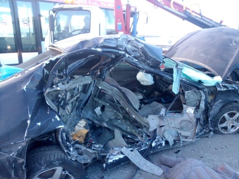 По предварительной информации, 31-летний мужчина на автомобиле Toyota Camry не справился с управлением, выехал на полосу встречного движения и врезался в ограждение, после чего столкнулся с автобусом Scania местного 27-го маршрута.