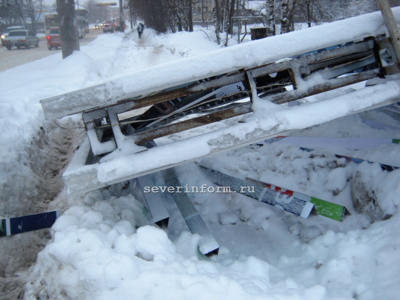 В дежурную часть ОБ ДПС ГИБДД по городу Вологде утром позвонил владелец рухнувшей рекламной конструкции. Он сообщил, что его щит упал на тротуар.