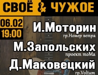 В Доме актера регулярно проводятся концерты. Поэтому музыканты решили не оставаться в стороне и организовали благотворительное мероприятие. Программа получила название "Свое&чужое". Ее представят Иван Моторин (группа "Номер ветра"), Мария Запольских, Дмитрий Маковецкий (группа "Voltum").