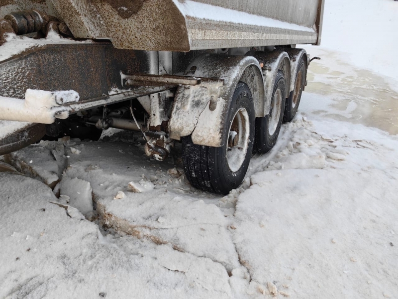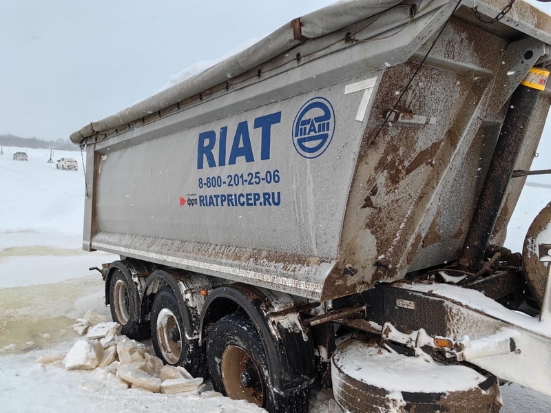 При выезде с ледовой переправы на правый берег Северной Двины большегруз продавил кромку льда.