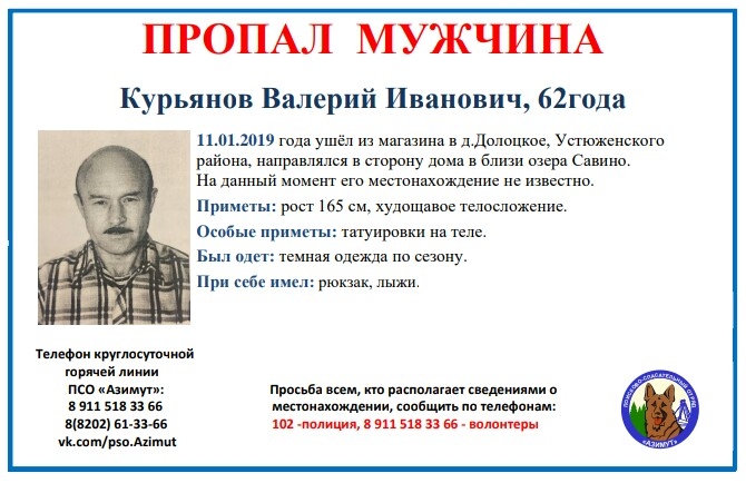 Под Устюжной в январе этого года ушел из дома и бесследно пропал пенсионер. Ориентировку на поиск опубликовал поисково-спасательный отряд «Азимут». По информации волонтеров, 62-летний Курьянов Валерий Иванович 11 января ушел из магазина в деревне Долоцкое и направлялся в сторону дома вблизи озера Савино. По пути мужчина исчез, о его дальнейшей судьбе ничего не известно.