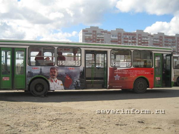 «Автобус Победы» с портретом Сталина уже ездит по улицам Вологды. Об этом сообщает ИА «СеверИнформ – Новости Вологды». К празднику 9 мая вологодским ветеранам сделали подарок – автобус 15-го маршрута с портретом Верховного Главнокомандующего. В первый рейс обновленный автобус вышел в пятницу, 4 мая.