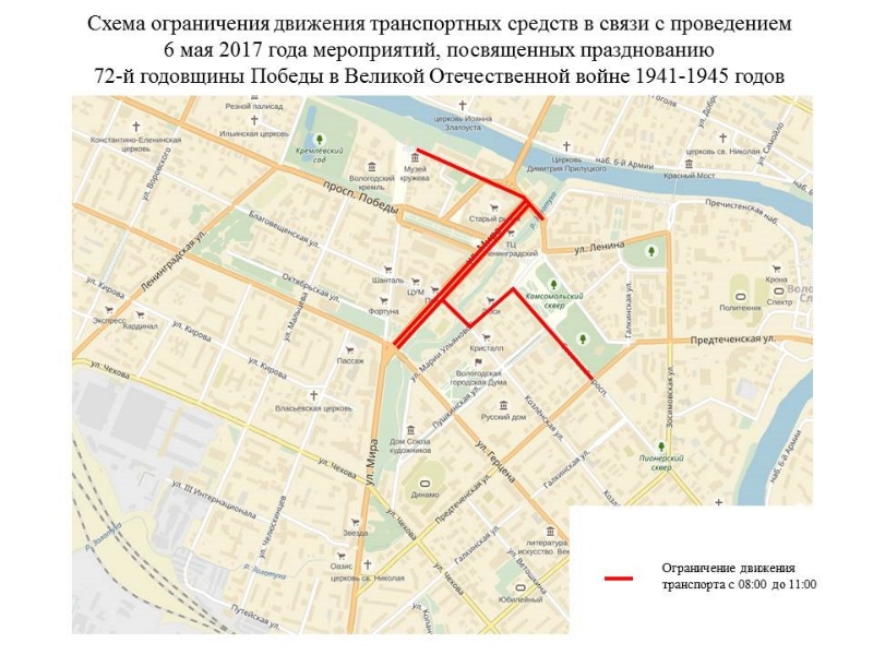 На время праздничных мероприятий, посвященных 9 мая, в центральной части Вологды перекроют движение автомобильного транспорта. Также изменятся некоторые маршруты движения общественного транспорта, - сообщает ИА «СеверИнформ» со ссылкой на пресс-службу Администрации города Вологды.