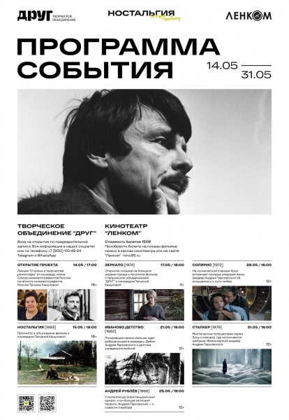 На самый большой экран Вологды вернутся знаковые ленты мастера: «Зеркало», «Иваново детство», «Андрей Рублев», «Солярис» и «Сталкер». Билеты по 150 рублей уже в продаже. Действует «Пушкинская карта», сообщает ИА «СеверИнформ».