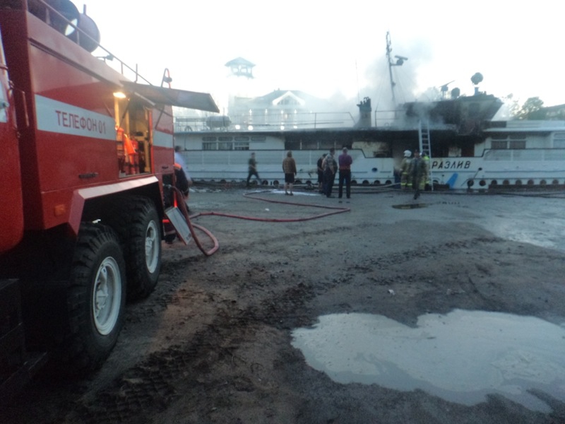 "В 02:09 на пульт дежурного поступило сообщение о пожаре на теплоходе "Разлив", который стоял у причала на улице Краснофлотской. Горело помещение кладовой и пищеблока судна. На тушение пожара выезжали 9 человек и 4 единицы техники", - сообщили корреспонденту ИА "СеверИнформ" в пресс-службе ГУ МЧС России по Вологодской области.