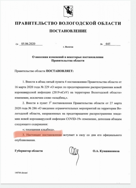 В нем говорится, что с сегодняшнего дня можно открыто посещать могилы на кладбищах. Ранее об этом с таким вопросом в связи с предстоящей Троицей обратился мэр Вологды Сергей Воропанов. Ответ ждали от Роспотребвнадзора. В итоге дали добро, сообщает ИА "СеверИнформ".