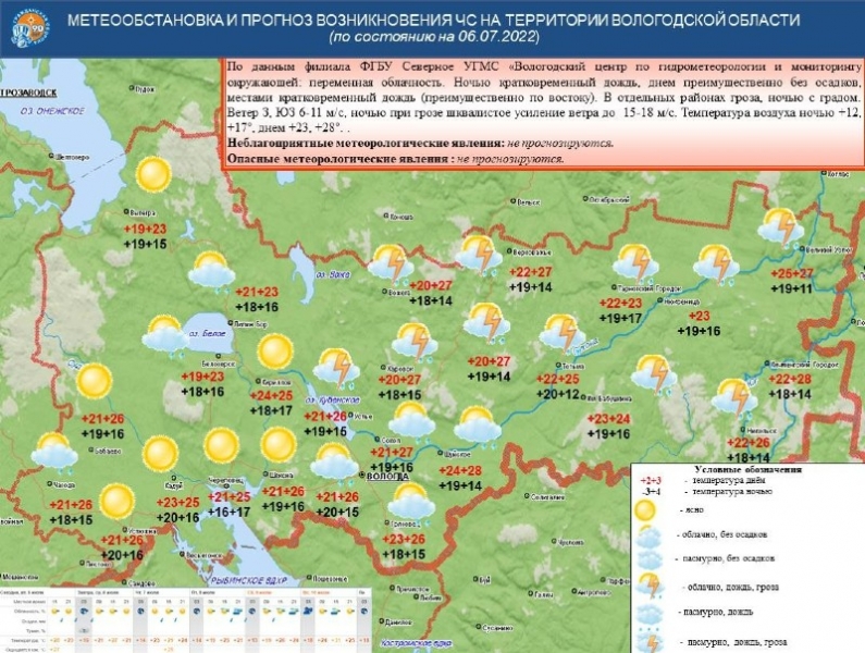 По данным Гидрометцентра, 6 июля в регионе ожидается переменная облачность, ночью кратковременный дождь, в восточных районах дождь, местами гроза с градом. Ветер западный, юго-западный 6-11 м/с, ночью при грозе шквалистое усиление ветра до 15-18 м/с. Температура воздуха ночью +12-17, днем до +30, сообщает ИА «СеверИнформ».
