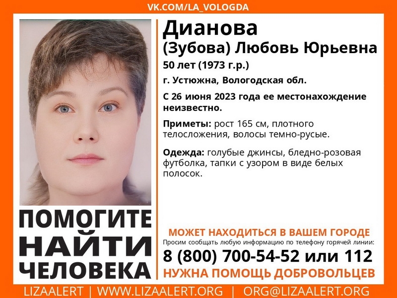 Если есть информация о Любови, звоните по телефону поискового отряда «Лиза Алерт»: 800-700-54-52 или 112, сообщает ИА «СеверИнформ».