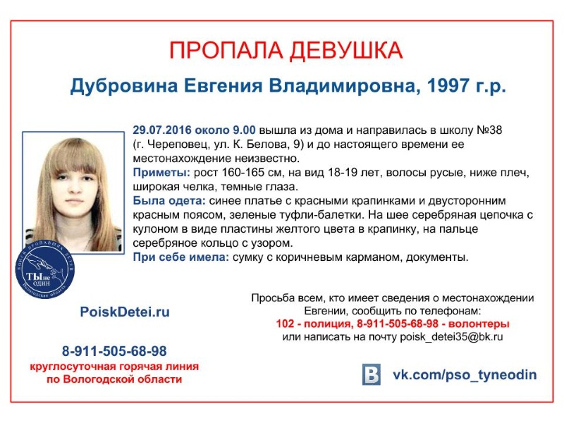 Всех, кто имеет какую-либо информацию о местонахождении Евгении, просят звонить по телефонам: 102 в полицию или 8(911)505-68-98 волонтерам. Моно также писать на почту poisk_detei35@bk.ru.