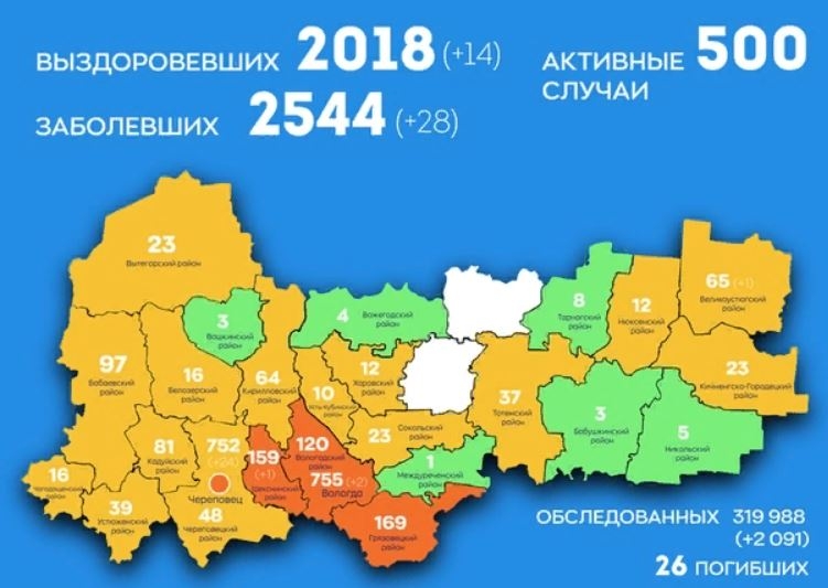 Всего в регионе 2544 случая. 2018 вологжанина уже выздоровели, в том числе, 14 за последние сутки. Активных больных сейчас 500. Количество умерших не изменилось - их 26.