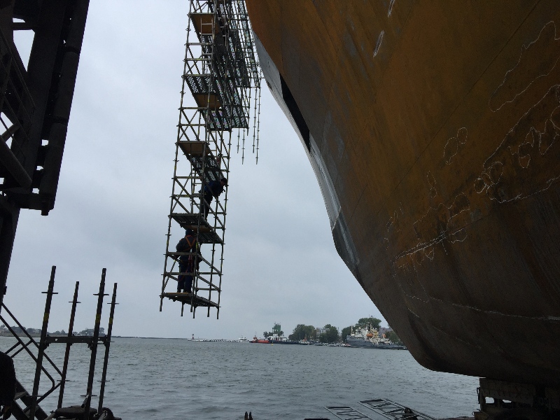 Как сообщает ИА «СеверИнформ», новая система лесов позволит сэкономить на крановых работах и обеспечит безопасный доступ заводчан в труднодоступные места корабля.